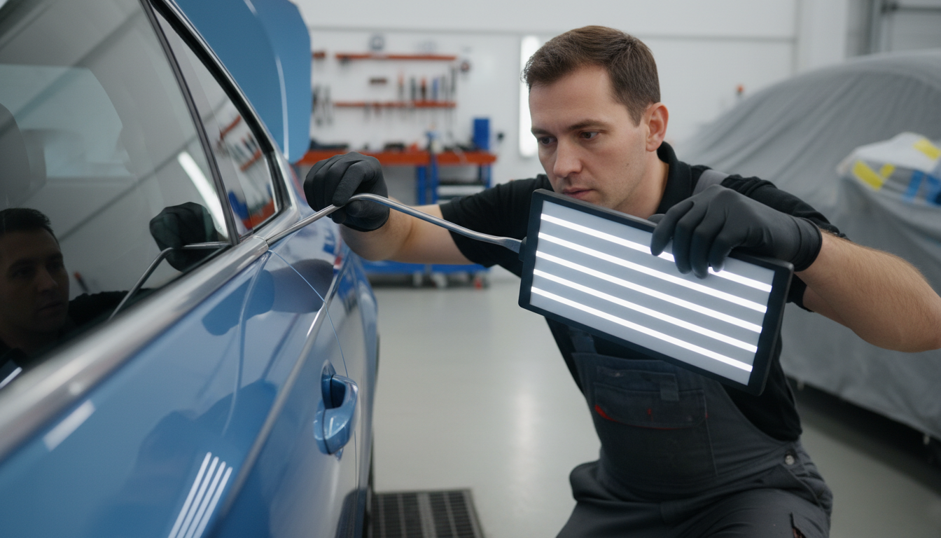 - 🚗 Le Débosselage Sans Peinture (DSP) : C’est le cœur de métier historique. Cette technique d’orfèvre permet de faire disparaître les bosses (coups de portière, grêle, projectiles divers) en massant la tôle de l’intérieur, préservant ainsi la peinture d’origine.